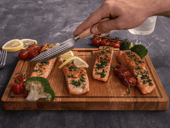 Staat er vanavond een heerlijk stuk gegrilde zalm of biologisch stuk tonijn op het menu? Dan mogen de steakmessen natuurlijk niet ontbreken op tafel. Met de messen snijd je in één haal door je botermalse stuk vis heen en voorkom je een zagende beweging. Hierdoor creëer je met het meeste gemak perfecte dunne plakjes. Ook zijn de messen fantastisch voor het doorsnijden van heerlijke maki-rollen én voor het snijden van sashimi (voor op de nigri). Voor de liefhebbers van sushi een Food Tool die absoluut niet mag ontbreken in de keuken. Op een leistenen serveerplank ziet je perfect gesneden verse sushi er nóg perfecter uit!