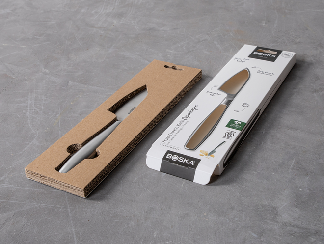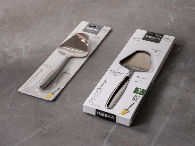 De oude verpakkingen van sets, zoals de kaasmessensets, hadden vaak een plastic kijkvenster. We hebben ze vervangen door dichte doosjes met afbeeldingen op ware grootte. Zo zie je precies wat je koopt, zonder onnodig plastic.
