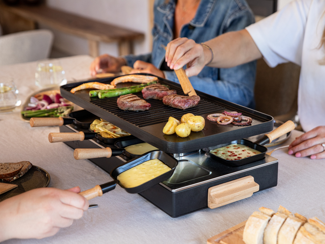 Met de BOSKA Raclette Gourmet Party wordt het aan tafel één groot culinair feestje. Terwijl je pannetje gevuld is met heerlijke kaas of andere ingrediënten, kun je op de royale grillplaat ondertussen lekker variëren. Bak er malse biefstukreepjes, een stukje zalm of garnalen op. Of ga voor vegetarische varianten zoals tempeh of een groenteburger. Zo maak je van jouw Raclette Gourmet Party een gezellige en smaakvolle avond voor iedereen!