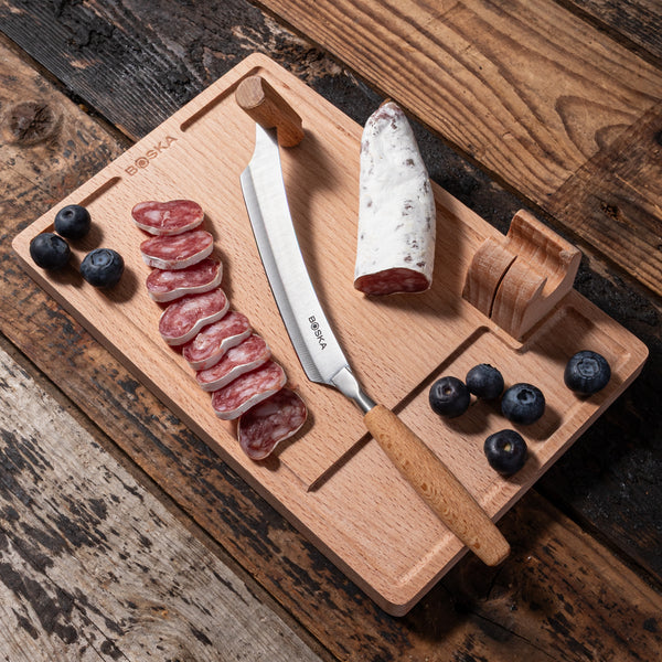 Der Käseschneider Lumberjack Amigo macht jedes Käsebrett zu einem Kunstwerk. Dieses Servierbrett mit integriertem Messer ist nicht nur praktisch, sondern auch ein stilvoller Mittelpunkt bei Ihrem Aperitif. Perfekt zum Schneiden von Käse und Wurst, sodass Ihre Gäste immer perfekt geschnittene Scheiben genießen können.