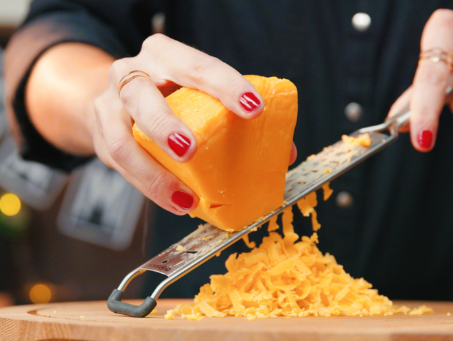 Not just for show: it keeps the cheese smooth and stops it from burning. A mini workout for your wrist.