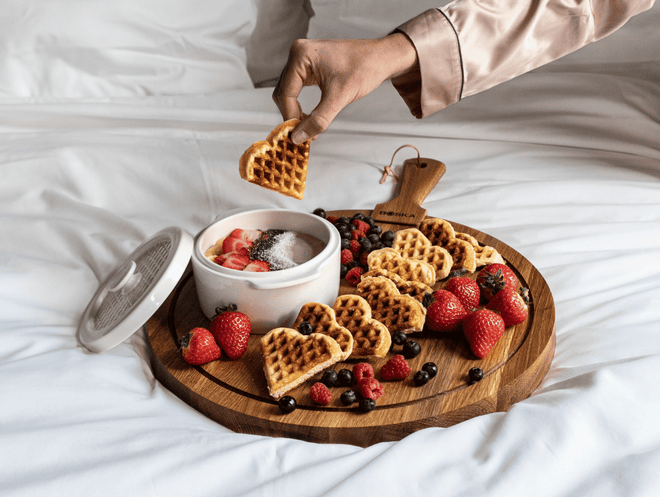 Votre maman est gourmande ? Surprenez-la avec un beau plateau de petit déjeuner sucré avec un bol de petit déjeuner, des gaufres, des fruits et d'autres petits plaisirs gourmands.
