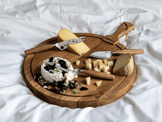 Voici comment les préparer : Prenez une belle planche de présentation en chêne et posez-y les fromages. Remplissez un Cheese Baker avec de délicieux crackers et des noix et terminez de dresser avec des fleurs comestibles.