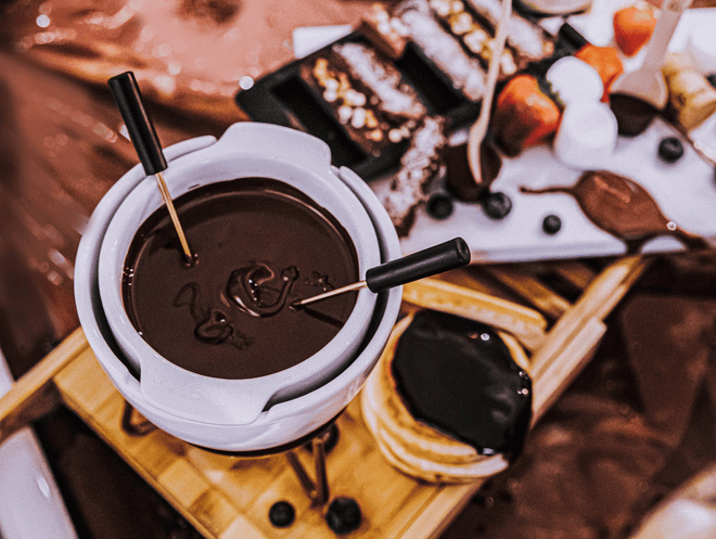 La vie est trop courte pour la prendre au sérieux. Car saviez-vous qu'en plus d'être délicieux, le chocolat est également parfait pour d'autres activités ? Mettez donc de vieux vêtements et défiez votre Valentin(e) dans une bataille de chocolat. Ou alors, mettez le moins de vêtements possible, prenez des pinceaux et peignez l'un sur l'autre comme sur une toile vivante pour une peinture en chocolat. Dans notre Choco Fondue Marie, le chocolat reste chaud pendant des heures, sans brûler. Parfait si vous vous laissez distraire entre temps 😉