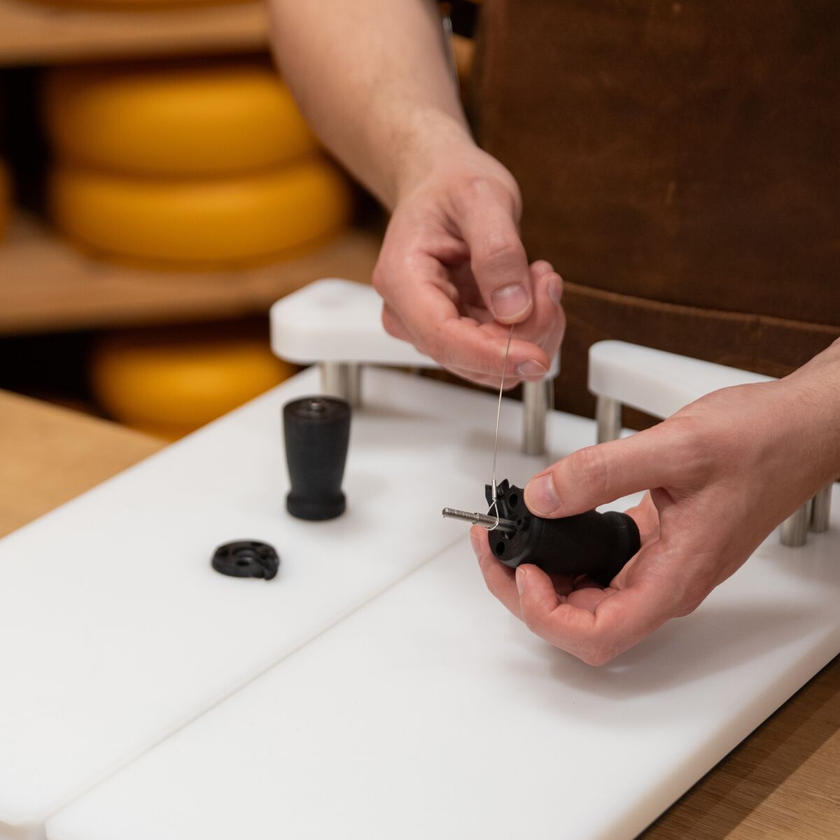 Le Cheese-O-Matic® est la machine à trancher idéale pour tout professionnel du fromage. Un système pratique pour couper facilement une meule entière. Qu’il s’agisse de fromages demi-durs ou durs comme le Gouda ou le Raclette, ce système offre une solution adaptée à chaque type de fromage. La coupe avec un fil permet une tranche lisse et nette, et glisse plus facilement dans le fromage qu’un couteau. Aucun gaspillage, et un résultat propre et précis. Les fils de coupe assortis (552010), qui assurent cette découpe nette, sont également disponibles séparément.